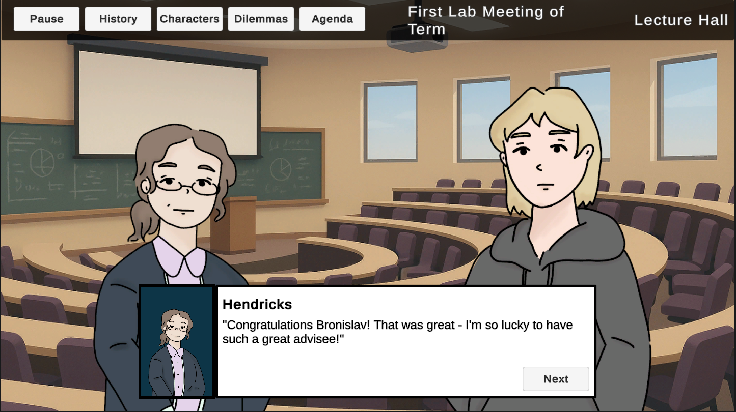 Academical is an NSF-funded research project that aims to create pedagogical experiences using a dynamic visual novel. Namely, it aims to teach researchers the ethics of performing research - what does it mean to perform "gift-authorship", what does it mean to have bad reviewer practices, and so on. While it plays in a straight-forward manner, there is complexity under the hood. The narrative system uses a variety of techniques depending on the version (there are currently 3) to dynamically sequence dialogue and ethical dilemmas.