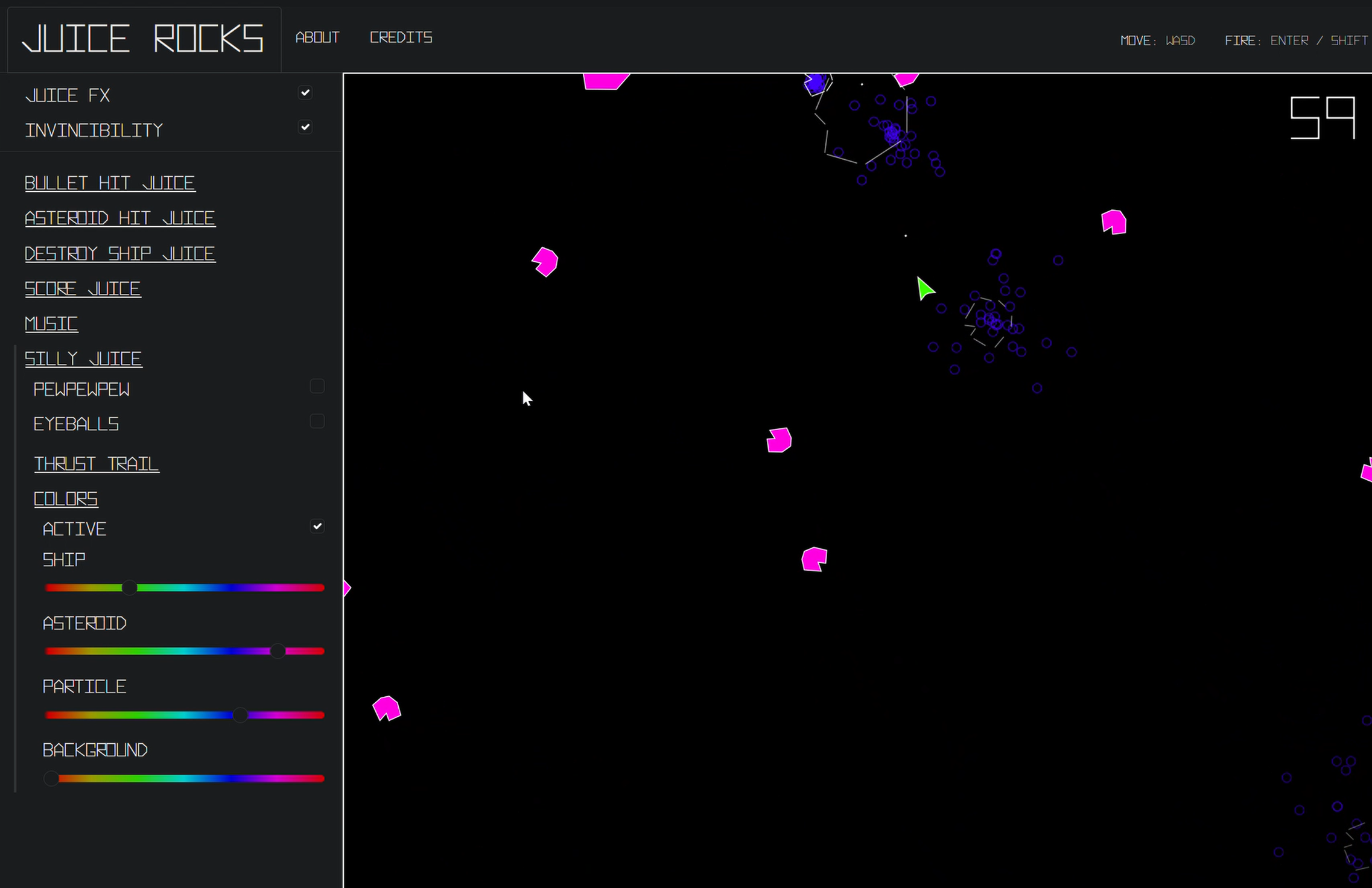 Use the menu on the left to change elements of game juice and get the desired interaction pattern you want between the ship, asteroids, and weapons. The settings should be self-explanatory, but experimentation is the most rewarding thing you can do with this system.
